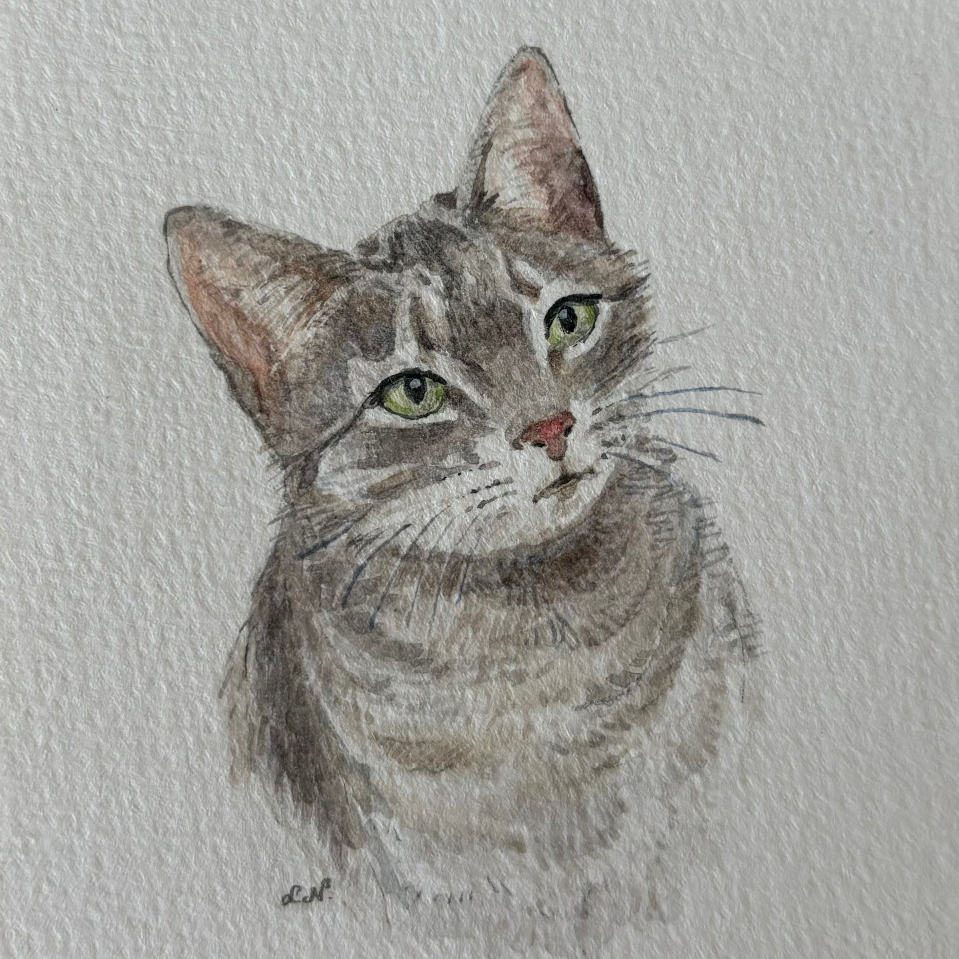 Custom order a miniature watercolour pet portrait by Lucy, Tela and Joseph’s granddaughter.