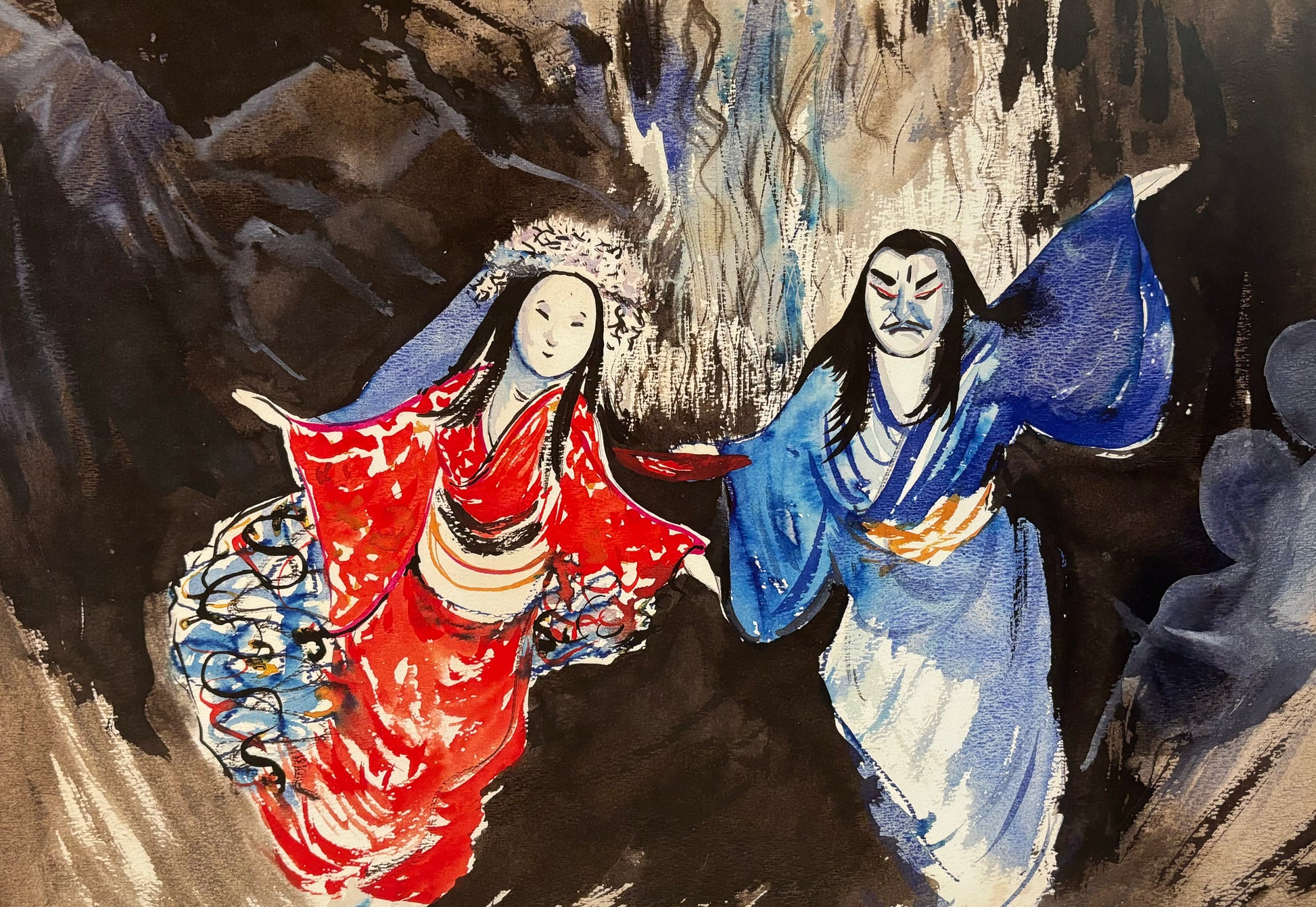 A print from an original watercolour by Tela Purcell of Japanese Kabuki Dancers