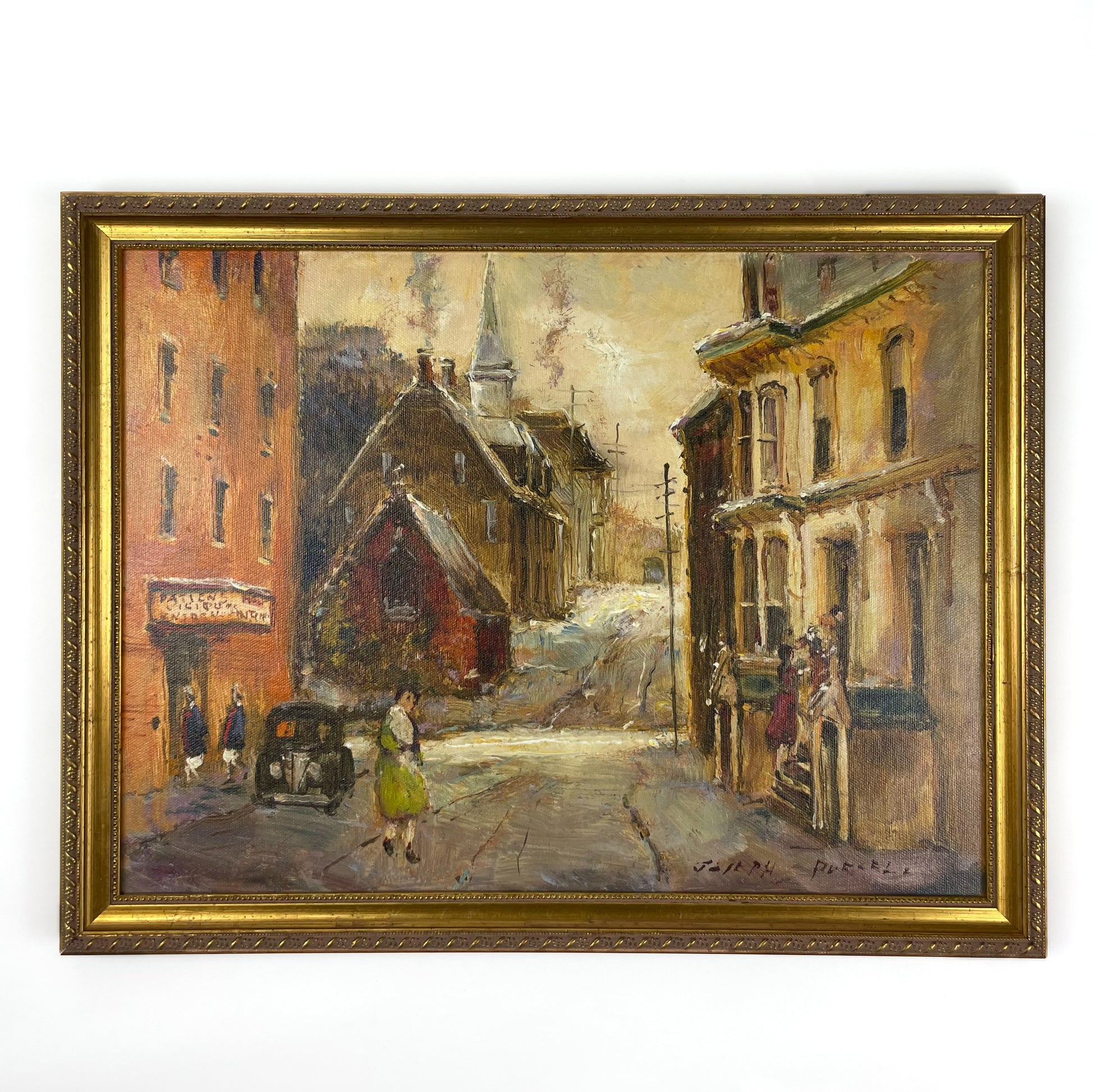 High quality giclée of an original oil of the old infirmary on Queen Street, Halifax, by Joseph Purcell. Giclée is printed on canvas and mounted on hard backing, clear coated for durability, framed in a gold wood frame.